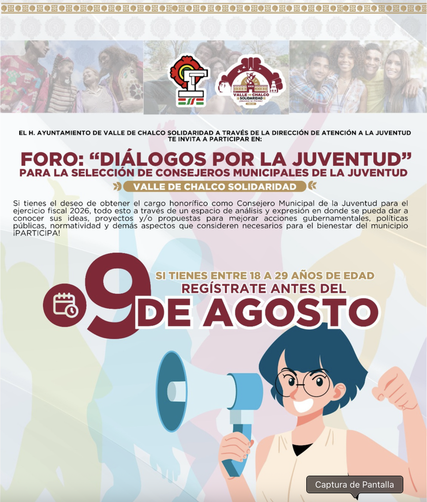 ¡AMPLIAMOS EL PLAZO!, INSCRÍBETE AL FORO “DIÁLOGOS POR LA JUVENTUD" , PARA LA SELECCIÓN DE CONSEJE...